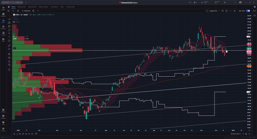 - Volume Profile (VPVR): The $155 – $165 zone shows a high volume of historical transactions, indicating a strong interest from buyers that could act as a safety net.